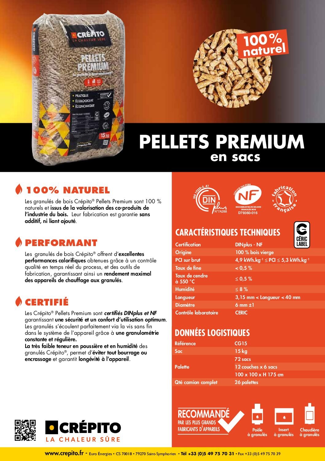 Dřevěné pelety Crépito® s certifikací NF a DINplus byly testovány a schváleny laboratoří CERIC , což zaručuje jejich kvalitu. Mezi jejich vlastnosti patří: